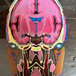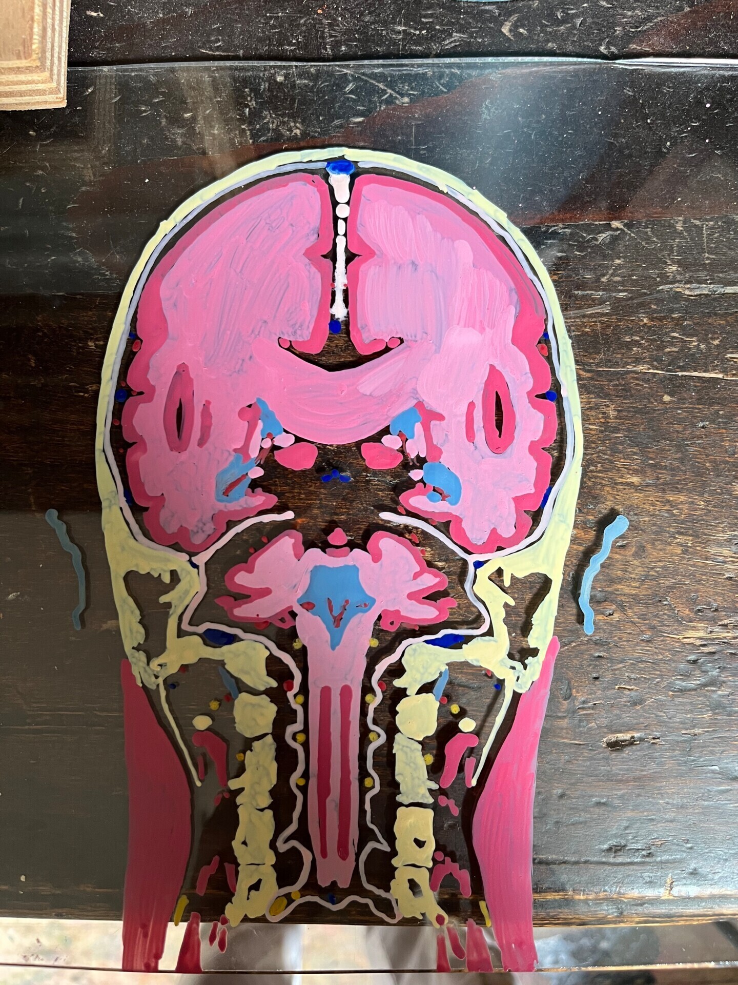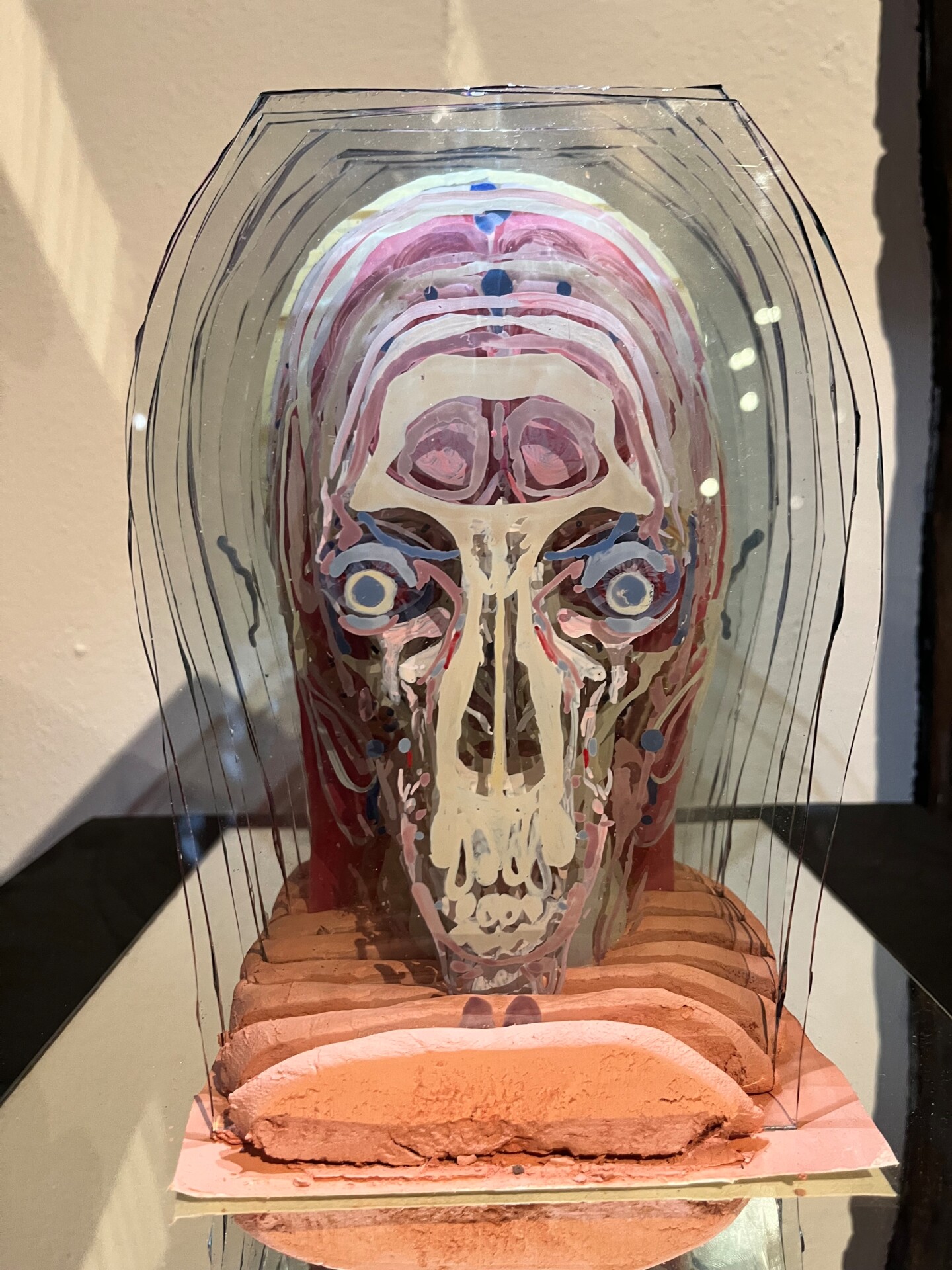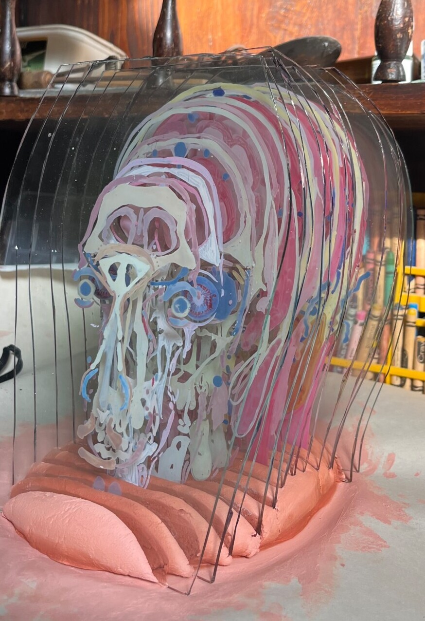 Peinture à l’huie sur verre, assemblage sur socle d’argile